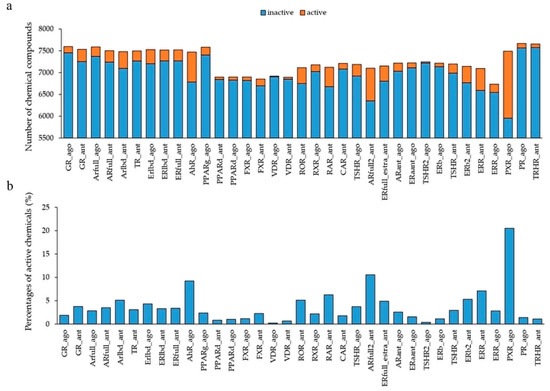 Activity distribution of the Tox21 10K library against 35 NR agonists and antagonists used in the DeepSnap-deep learning (DL) approach. (a) Number of chemical compounds used in the modeling by the DeepSnap-DL, where orange and blue indicate active and inactive chemicals, respectively. (b) Percentage of active chemicals against total chemicals.