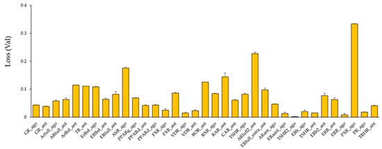 Average Loss values in the validation (Val) dataset in models of 35 NR agonists and antagonists constructed by DeepSnap-DL. n = 2. Each bar indicates average of Loss (Val) ± standard error.