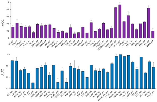 Average Matthews correlation coefficient (MCC) (top) and area under the curve (AUC) (bottom) values in the Test dataset in the models of 35 NR agonists and antagonists constructed by DeepSnap-DL. n = 2. Each bar indicates average MCC and AUC ± standard error.