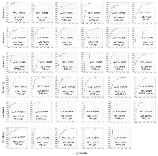 In this study, the original datasets related to chemical structures and the corresponding agonist and antagonist scores were downloaded as reported previously [44,45,46,47], in the simplified molecular input line entry system (SMILES) format from the PubChem database. We used a keyword of the database search, namely “Tox21 bioassays”, and selected bioassays of the 35 from the NR signaling pathway for the identification of agonists/antagonists (Table 1). These bioassay data consisted of quantitative HTS (qHTS) data derived from two cell-based reporter gene assays, including beta-lactamase or luciferase reporter genes. The activity of these reporter genes is controlled by the binding of transcriptional factors induced or suppressed by an agonist/antagonist with response elements (REs) for ARs, ER-alpha, ER-beta, estrogen-related receptors (ERR), FXR, PPAR−gamma, PRs, retinoid-related orphan receptor gamma (ROR−gamma), RXR−alpha, RARs, GRs, TRs, thyroid-stimulating hormone receptors (TSHRs), aryl hydrocarbon receptors (AhRs), VDRs, constitutive androstane receptors (CARs), and PXRs. These receptors are stably integrated into cell lines, including human embryonic kidney 293 cells(HEK293 (AR, ER−alpha, ER−beta, ERR, and TSHR), HEK293H (PPAR−gamma, PPAR−delta, and HEK293T (ER−beta, FXR, PR, RXR−alpha, and VDR)), human breast cancer cells (MDA−MB (AR)), ovarian carcinoma cells (BG1 (ER−alpha)), Chinese hamster ovary cells CHO (ROR−gamma)), human cervical cancer cells (HeLa (GR)), rat pituitary tumor cells (GH3 (TR)), human hepatocellular carcinoma cells (HepG2 (AhR, CAR, PXR)), and C3H mouse embryo cells (C3RL4 (RXR−alpha)). Then, we can measure the ability to induce or inhibit RE-dependent transcription.