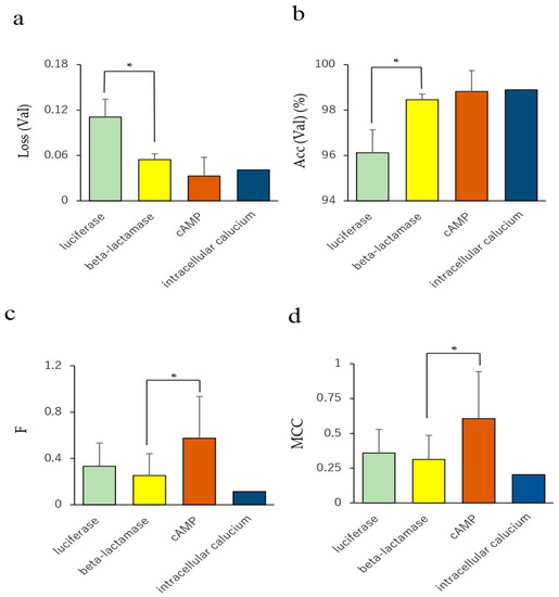 Comparison of prediction performance among four in vitro assays. (a) Loss in the Val dataset, (b) accuracy in the Val dataset, (c) accuracy in the Test dataset. n = 14, 17, 3, and 1 for luciferase, beta-lactamase, cAMP, and intracellular calcium assays, respectively. Each bar indicates the average of the performance metric of the four in vitro assays with standard error. * p < 0.05 by Tukey–Kramer’s honestly significant difference test.