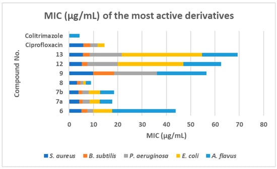 The antimicrobial activity of all synthesized compounds 2–13 was screened against a panel of two Gram-positive bacteria (Staphylococcus aureus ATCC 29213 and Bacillus subtilis ATCC 6633), two Gram-negative bacteria (Escherichia coli ATCC 25922, Pseudomonas aeruginosa ATCC 27853) and two fungi (Candida albicans ATCC 10231 and Aspergillus flavus ATCC 46283) using the agar well diffusion method [24]. Ciprofloxacin and clotrimazole were used as antibacterial and antifungal standards, respectively. The results of this study were recorded as the average diameter of the inhibition zones (IZ) in Table 1. It was found that compounds 7a, 7b and 8 revealed excellent improved antimicrobial activity against all Gram-positive and Gram-negative bacteria, and the fungal A. flavus while moderate activity against C. albicans. Moreover, compound 6 displayed higher activities against Gram positive bacteria (S. aureus and B. subtilis) and the Gram-negative P. aeruginosa and weak activity against the remaining strains. Additionally, the promising activity against S. aureus was observed from compounds 9, 12 and 13, however against B. subtilis from compounds 12 and 13. The remaining derivatives demonstrated potencies from moderate to weak in comparison with the reference drugs. The antifungal potency against C. albicans for all tested derivatives ranged from weak to no activity at all. Additionally, it was noticed that compounds 2 and 3 showed no activity against all the screened strains. The most active targets 6, 7a, 7b, 8, 9, 12 and 13 were further investigated for the assignment of the minimum inhibitory concentration (MIC) (Table 2, Figure 2). Compound 8 explored the best potential MIC values ranged from 0.95 ± 0.22 to 3.25 ± 1.00 μg/mL in comparison with that of the standard compounds, followed by 6, 7a, 7b, 12 and 13 (MIC ranged from 1.39 ± 0.50 to 33 ± 0.10 μg/mL).