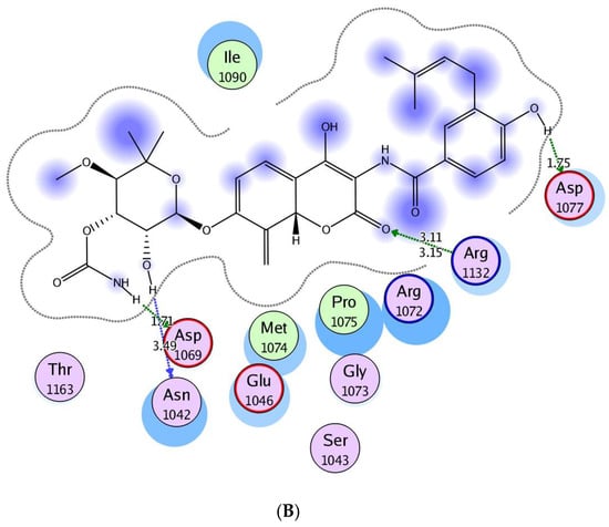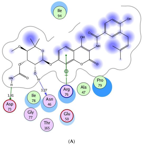 Two-dimensional interaction diagrams of novobiocin redocked in the active sites of E. coli DNA gyrase B (PDB ID: 1AJ6) (A) and Topoisomerase IV (PDB ID: 1S14) (B), respectively using Molecular Operating Environment (MOE) software. H-bond interactions with the proteins are shown as dashed arrows.