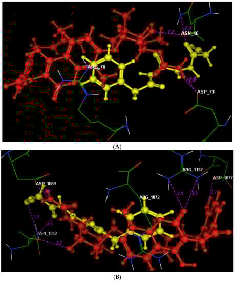 As reported previously in docking of novobiocin [26,31], fixation within the active site of DNA gyrase B kinase was done through two hydrogen bonds with the essential amino acids Asp46 and Asp73 and arene-cation interaction with Arg76. While within the ATP binding pocket of Topoisomerase IV, it linked to the four key amino acids Asn1042, Asp1069, Asp1077 and Arg1132 via hydrogen bonding (Figure 3).