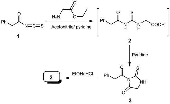 Reaction of benzylisothiocyanate 1 and ethyl glycinate in the presence of a small amount of pyridine gave thiourea derivative 2 as an intermediate, which was cyclized in situ to 3-(2-phenyl-acetyl)-2-thioxoimidazolidin-4-one (3), which was opening by refluxing in ethanol/hydrochloric acid to obtain thiourea derivative 2 (Scheme 1). The 1HNMR for the linear-adduct 2 revealed the presence of two singlet signals for NH protons in the downfield region, as well as triplet and quartet signals for the ethyl group (CH3CH2) beside two singlet signals at δ 3.46 and δ 3.79 for 2CH2 protons and a multiplet signals for phenyl protons. On the other hand, IR spectrum of 3 shows high absorption band of cyclic carbonyl group at 1741 cm−1 and its 1HNMR spectrum displays a broad singlet signal for the NH proton that is exchangeable with D2O.