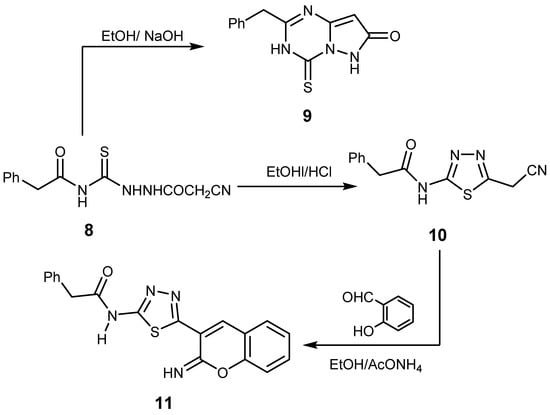 Cyclization of thiosemicarbazide derivative 8 by heating in ethanol, in the presence of sodium hydroxide or hydrochloric acid afforded the corresponding pyrazolotriazinone derivative 9 and N-(5-(cyanomethyl)-1,3,4-thiadiazol-2-yl)-2-phenylacetamide 10, respectively. The latter compound 10 was reacted with salicaldehyde in refluxing ethanol, in the presence of ammonium acetate to give the thiadiazolochromen derivative 11 (Scheme 3).
