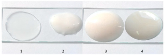 Macroscopic image of the hydrogel ointment and prepared ointments with ACTH: 1-Glycerol ointment, 2-Glycerol ointment with ACTH 15 mg/g (F-9), 3-Glycerol ointment with ACTH 20 mg/g (F-8) and 4-Glycerol ointment with ACTH 25 mg/g (F-7).