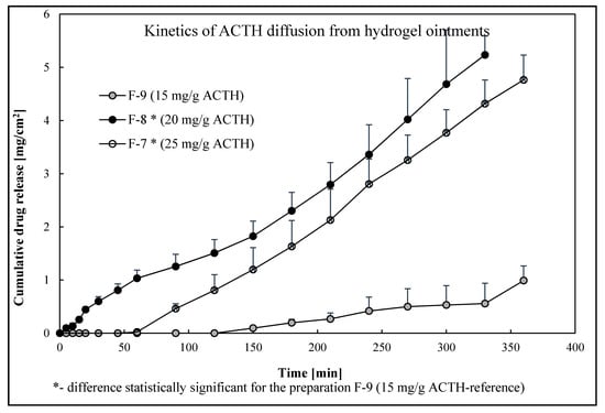 The Weibull method (p < 0.05) showed significant statistical differences in the ACTH release profiles from the prepared ointments (fitting coefficients: F-7, R2 = 0.521 and F-8, R2 = 0.844) in relation to the F-9 formulation.