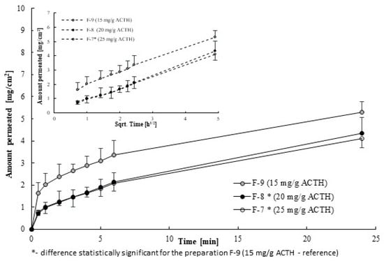 As shown in Table 4, the rate of penetration decreases with the loading of ACTH. The fastest ACTH permeates from the ointment with the lowest concentration (p < 0.05)-15 mg/g (F-9), about 1.3 times faster than from the ointment with the highest concentration-25 mg/g (F-7). From F-7 formulation ACTH penetrates the slowest.