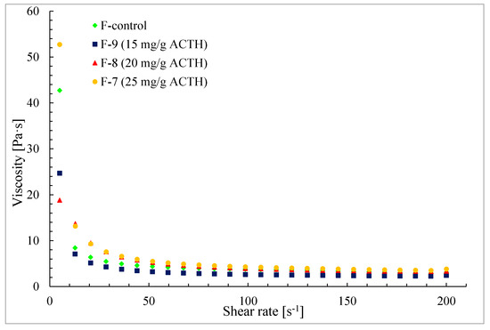 The addition of ACTH causes an increase in viscosity in comparison to not loaded base (F-control). Both of at the shear rate D = 15 s−1 and D = 30 s−1 this increase is noticeable in all formulations containing ACTH.