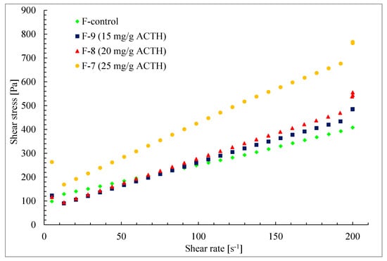 The lowest viscosity (η) was observed for ointment not loaded with active substance (F-control, η = 6.01 ± 0.26 Pa·s at D = 15 s−1 and η = 6.08 ± 0.17 Pa·s at D = 30 s−1). The highest viscosity for ointment containing ACTH at concentration of 25 mg/g (F-7) was observed. The results of the viscosity determination clearly show that the viscosity increases with increasing ACTH concentration in the ointment.