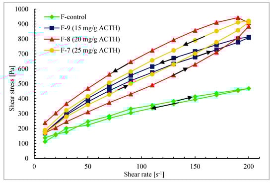 The analysis was carried out in the tangential stress range 5.0–200.0 s−1. The obtained results are presented in the form of shear rate dependence on shear stress as flow curves and also in the form of hysteresis loop for step-by-step test.