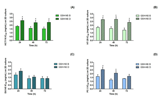 The basal level of reduced glutathione was measured in each of the different cell lines, which were grouped according to cancer type. The results show that HT-29 (Figure 1A) and PC-3 cells (Figure 1B) display significantly lower GSH levels than those in HCT116 (Figure 1A) and DU145 cells (Figure 1B). Dose-response curves were then performed by exposing human colorectal cancer, HCT116 and HT-29, and human prostatic carcinoma, DU145 and PC-3, cell monolayers to various concentrations (0.5, 1.0, 2.0, and 3.0 mg/mL) of the two types of GSH-NSs with increasing disulfide bridge content (GSH-NS B and D), for 24, 48, and 72 h. Table 2 reports the IC1 and IC50 values of GSH-NS, which were determined at 24, 48, and 72 h of exposure.