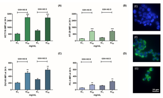 After exposure to the respective GSH-NS B and GSH-NS D IC50 values at 24 h, the dichlorofluorescein-diacetate (DCFH-DA) assay did not indicate a significant intracellular ROS increase at 1, 12 (data not shown), and 24 h (Figure 5) in all cell lines considered, except for HCT116 cells, where a significant increase in intracellular ROS was observed at 24 h (Figure 5A) after both GSH-NS formulations incubation (Figure 5A).