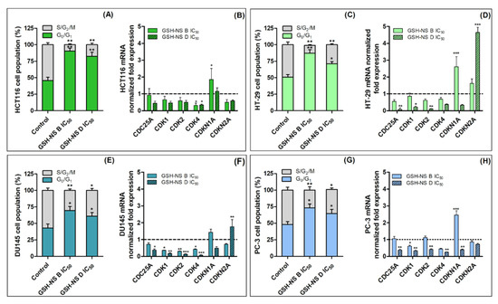 Thus, to confirm these data, an analysis of mRNA expression of the different cyclin-dependent kinases (CDK) was performed, as they participate in cell cycle regulation, especially during the G1 to S phase transition. It was observed that CDK1, CDK2, and CDK4 mRNA expression was down-regulated in almost all cell lines, as compared with untreated cells (Figure 4B,D,F,H). Interestingly, the mRNA expression of the CDK activator, CDC25A, was either unaffected or down-regulated, compared with untreated cells, whereas the mRNA expression of the CDK inhibitors, CDKN1A and CDKN2A, was up-regulated compared with untreated cells (Figure 4B,D,F,H). No significant differences in the extent of cell cycle arrest were observed between the two nanosponge formulations. However, the formulation with the higher disulfide-bond content, GSH-NS D, seemed to induce a higher down-regulation in CDK mRNA and higher up-regulation in CDKN2A mRNA in HT-29 and DU145 cells, whereas GSH-NS B induced a higher CDKN1A mRNA expression in HCT116 and PC-3 cells. Furthermore, no significant differences were observed in terms of the extent of cell cycle arrest and gene expressions between cell lines with higher (Figure 4A–F) and lower GSH content (Figure 4C,D,G,H).