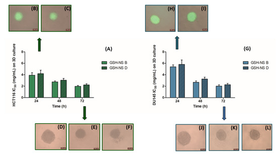 The next step was the analysis of GSH-NS cytotoxicity in the colorectal and prostatic cancer cell lines with the highest GSH basal level, HCT116 and DU145, which were three-dimensionally cultured as multicellular spheroids (MCSs), cellular aggregates organized in a specific cell-to-cell and cell–matrix interaction, closer to in vivo features [41]. Dose response curves were obtained by exposing HCT116 and DU145 on 3D model to different concentrations (0.5, 2.0, 4.0, and 6.0 mg/mL) of GSH-NS B and GSH-NS D, for 24, 48, and 72 h to obtain the respective IC1 and IC50 values (Table 3 and Figure 6A,G). The MCS uptake of non-cytotoxic (IC1) and cytotoxic (IC50) concentrations of fluorescent GSH-NS was confirmed by fluorescence microscope imaging after 24 h of exposure (Figure 6B,C,H,I).
