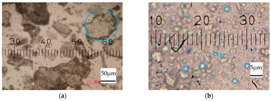 Figure 1 depicts microscopic images of CT in different forms. The particle size of commercial CT was considerable (ranging from 50 to 100 μm, as shown in Figure 1a, highlighted with a blue circle). However, after grinding by the ball mill technique, the particle size of the CT was significantly reduced (ranging from 1 to 5 μm, as shown in Figure 1b, highlighted with a blue circle). From Figure 1, this indicates that CT particles could be broken down into smaller particles during the ball mill mixing and then sodium naphthalene sulfonate (SNS) acting as a dispersing agent covers the CT particles, as shown in Figure 2b. Therefore, the CT particles were stable because SNS shows a negative charge around the CT particles.