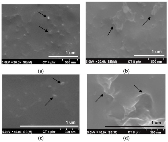 Figure 3a,b show the SEM micrographs taken at a magnification of 20k of the NR/CT biocomposites containing 4 phr and 8 phr of CT. The white spots and high ridges represented the CT particles (indicated by arrows) embedded in the NR matrix (a grey area). It could be perceived that the particle size of CT particles was relatively small, falling in the range of 1–2 μm. It was clear from the micrographs that a fine and uniform phase distribution was exhibited in the NR/CT biocomposites. Figure 3c,d show the SEM micrographs taken at a magnification of 40k of the NR/CT biocomposites containing 4 phr and 8 phr of CT. The CT particles could be seen more clearly at higher magnifications. From Figure 3d, there was no formation of holes or voids at the interface between rubber and CT indicating the good rubber–CT interaction in the NR matrix. Again, SNS can act as a dispersing agent and thus improve the interaction between rubber chains and CT particles, allowing a good dispersion of CT in the rubber matrix. In Figure 2b, the incorporation of SNS introduces the formation of hydrogen bonds between sulfonate groups of SNS and the hydroxyl and amine groups on the CT surface. Additionally, chemical reactions between the sulfonate groups with the hydroxyl and amine groups and rubber molecules may occur during the compound mixing and these should enhance filler–rubber interactions resulting in a better CT dispersion in the rubber matrix.