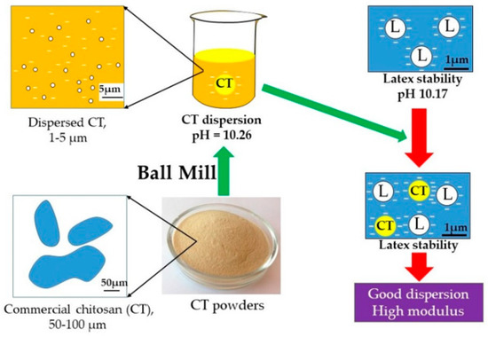 Natural rubber latex (NRL) is a colloid system comprising of rubber particles dispersed in water. The rubber particles are covered by a layer of negatively charged proteins and lipids, which provides colloidal stability to the NRL [1]. NRL undergoes coagulation at room temperature by adding an acid such as formic acid and other acids or salts, i.e., calcium chloride, calcium nitrate, etc. [2]. The products from NRL such as tubing, pillow foam, rubber nipple, surgical glove, and catheter find extensive applications in the biomedical field [3]. The advantages of these products are their elasticity and flexibility [4]. However, the products from NRL show some weaknesses such as low modulus, barrier properties and electrical properties that affect the quality of the natural rubber (NR) products. Consequently, many attempts have been made to use a reinforcing filler such as graphene oxide [5], multiwalled carbon nanotube [6], organoclay [7,8], carbon black [9], silica [10], cassava starch [11], and carbon fiber [12], to improve NR properties. The incorporation of bio-fillers from renewable resources into NRL could result in new biocomposites with enhanced features and biodegradability, so it is of interest to study the possibility of using chitosan (CT) as a reinforcing filler for NRL.