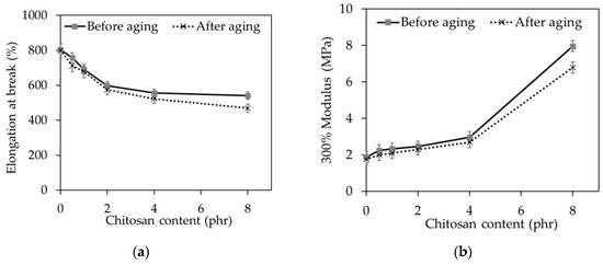 The changes in mechanical properties with hot air aging, viz. 300% modulus and elongation at break, are shown in Figure 6 and Figure 7. It could be seen that elongation at break and the 300% modulus of all NR/CT biocomposites decreased after being exposed to hot air aging. The oxidation effect could be used to explain the results, and chitosan could not help to prevent the oxidation of rubber.