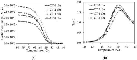 The dynamic mechanical analysis was a useful tool for obtaining some indirect evidence on the dispersion and rubber–graphene interaction [5,27]. From dynamic mechanical measurements, the elastic modulus and tan δ for the NR/CT biocomposites were obtained and plotted against the temperature, as shown in Figure 7a,b, respectively. At the transition zone, the elastic modulus significantly decreased with increasing temperature due to the higher molecular movement ability. It could be observed that, at the temperature below the glass transition temperature (Tg), modulus of the biocomposites increased with increasing CT loading mainly due to a higher stiffness or modulus of the glassy CT.
