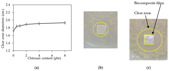 Antibacterial activity of all NR/CT biocomposite films (a), picture of unfilled biocomposite (b) and picture of biocomposite containing 8 phr of CT (c).