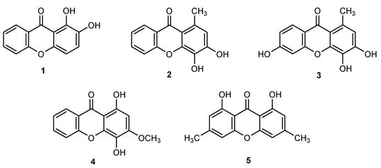 Xanthones investigated in the scope of this work: 1,2-dihydroxy-9H-xanthen-9-one (1), 3,4-dihydroxy-1-methyl-9H-xanthen-9-one (2), 3,4,6-trihydroxy-1-methyl-9H-xanthen-9-one (3), 1,4-dihydroxy-3-methoxy-9H-xanthen-9-one (4), and 1,8-dihydroxy-3,6-dimethyl-9H-xanthen-9-one (5).