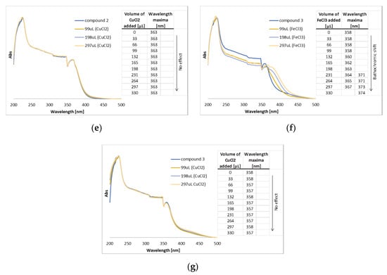The ultraviolet/visible (UV/Vis) spectra were recorded in methanol using a path length of 1 cm, at room temperature on a Varian CARY100 spectrophotometer (Agilent Technologies, Santa Clara, California, United States) from a range of 200 nm to 500 nm (software CaryWin UV, v. 3.0). The metal-chelating effect was evaluated by described procedures [36] with stock solutions (1.0 × 10−4 M) in methanol. Iron (III) and copper (II) solutions were prepared in a concentration of 1.0 × 10−3 M from FeCl3 and CuCl2 in deionized water. Briefly, sequential additions of 33 μL of metal ion solution were performed to 3 mL of compounds 1, 2, and 3.
