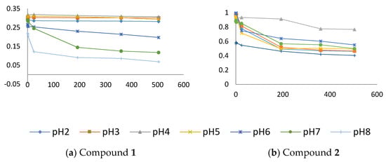 The graphs depicting absorbance versus time (0, 1, 2, 24, 192, 360, and 504 h) at different pH are overlapped for xanthones 1 (1,2-DHX) and 2 (Figure 3A,B, respectively) in order to understand the variation in the absorbance peak. Considering xanthone 2, a degradation of the compound for the range of pH tested overtime is observed. 1,2-DHX (1) revealed to be more stable in the pH range that is closest to the pH of the skin, thus presenting a potential to be used as a future cosmetic active agent.