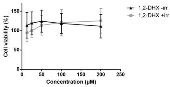 Cell viability of the HaCaT cell line exposed to 1,2-DHX (1; 12.5, 25, 50, 100, and 200 µM) for the evaluation of phototoxicity by the HaCaT NRU assay. Data are presented as mean ± SD (n = 3) relative to solvent control, with (+irr) = 100 ± 20.5 (n = 3) and (-irr) = 100 ± 16.9 (n = 3). Data were analyzed using one-way ANOVA with a Dunnett post hoc test.