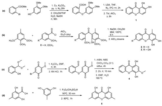 Synthesis of (a) 1,2-dihydroxy-9H-xanthen-9-one (1); (b) 3,4-dihydroxy-1-methyl-9H-xanthen-9-one (2) and 3,4,6-trihydroxy-1-methyl-9H-xanthen-9-one (3); (c) 1,4-dihydroxy-3-methoxy-9H-xanthen-9-one (4); and (d) 1,8-dihydroxy-3,6-dimethyl-9H-xanthen-9-one (5).