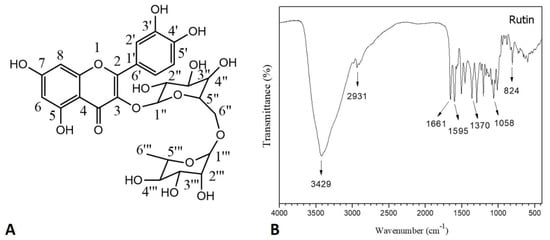 Characterization of Rutin (RUT). (A) Chemical structure of RUT; (B) Absorption spectroscopy in the infrared region of RUT.