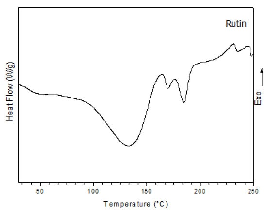 Approximately 5.0 mg of RUT was weighed and added to a hermetically sealed aluminum pan. The analysis was carried out under the following conditions: nitrogen atmosphere with flow rate of 50 mL min−1, heating ramp from 25 to 500 °C and heating rate of 10 °C min−1 in a DSC 50 Shimadzu equipment (Kyoto, Japan).