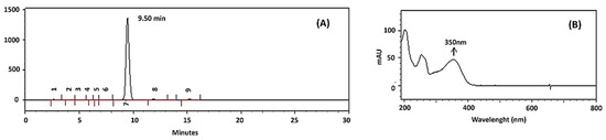 Figure 3 shows the High Performance Liquid Chromatography (HPLC) chromatogram (A) and the absorption spectrum in the UV-Vis region of the isolated RUT from D. gardneriana (B). The isolated RUT had a retention time of 9.50 min and a purity of 97% HPLC grade. In addition, the scanning spectrum in the UV-Vis region indicated a maximum absorbance peak at 350 nm.