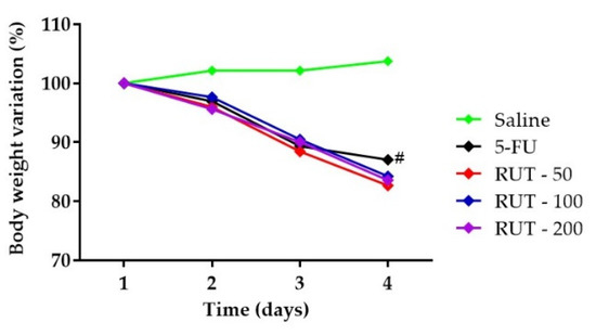 Body weight variation in mice subjected to induced intestinal mucositis (5-FU, 450 mg/kg, intraperitoneally, single dose) and treated with RUT (50, 100, and 200 mg/kg for 3 days). The results are expressed as the mean ± standard error of the mean (SEM) of the weight evaluation percentage of the initial weight, for a minimum of 6 animals per group. Statistical analysis was performed using two-way analysis of variance (ANOVA) followed by Tukey’s test. # p < 0.05 vs. saline.