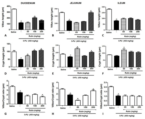 We demonstrated that 5-FU significantly decreased crypt depths in the duodenal segment when compared with the depths in the saline group; RUT 50, 100, and 200 mg/kg prevented the decrease in crypt depths when compared with the 5-FU treatments (p < 0.05). Additionally, in the jejunum, a significant decrease in crypt depths was induced by 5-FU (p < 0.05) treatment when compared to the crypts in the saline group; RUT 50 and 200 mg/kg reversed the decreases in crypt depth induced by 5-FU. In the ileum, no significant differences (p < 0.05) were observed in crypt depths between the 5-FU and saline groups.