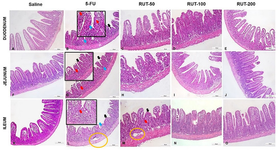 As shown in Table 2, the administration of 5-FU induced changes in the intestinal mucosa of mice, as evidenced by reduced villus height, crypt necrosis and hypoplasia, intense inflammatory cell infiltration, vacuolization, and edema of intestinal mucosal and muscular layer cells. In the 5-FU-administered group, this resulted in a significant increase in the microscopic score when compared to the saline group (p < 0.05) in the three intestinal segments. Notably, RUT treatment (200 mg/kg) significantly decreased (p < 0.05) the histopathological scores when compared to the 5-FU lesion group, demonstrating the reversal of decreased villus height and vacuolization, as well as the attenuation of crypt necrosis and inflammatory cell infiltration into the intestinal mucosa in the duodenal and jejunal segments. In the three intestinal segments, RUT (50 and 100 mg/kg) demonstrated no significant decrease (p > 0.05) in the histopathological scores induced by 5-FU.