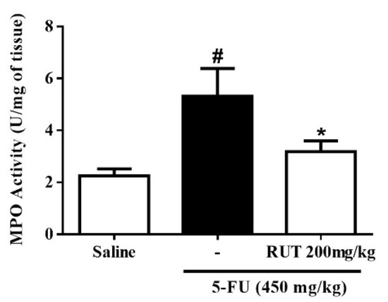 To investigate the effects of RUT pretreatment on neutrophil recruitment in 5-FU-induced intestinal mucositis, we evaluated the levels of myeloperoxidase (MPO), a neutrophil marker, in the jejunum. As shown in Figure 7, 5-FU significantly increased MPO levels per mg of tissue in the jejunal segment when compared to the saline group (p < 0.05). Conversely, RUT 200 mg/kg significantly decreased MPO levels when compared to the 5-FU group (p < 0.05) and, therefore, decreased neutrophil infiltration (Figure 7).