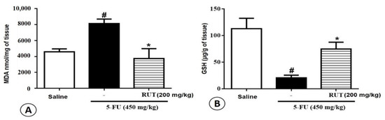 Analysis of oxidative stress. (A) Malondialdehyde (MDA), (B) Glutathione (GSH). Experimental groups: Saline, 5-FU, and RUT 200 mg/kg. Values are presented as mean ± SEM. For the statistical analyses, one-way analysis of variance was used, followed by Tukey’s test. # p < 0.05 vs. saline group and * p < 0.05 vs. group 5-FU. 5-FU, 5-fluorouracil; RUT, rutin.