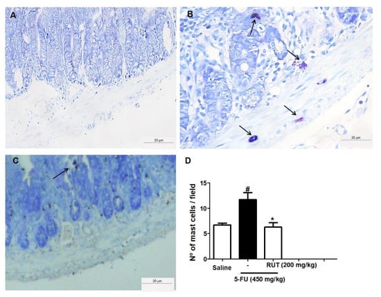 In the present study, RUT reversed the increase in mast cell numbers induced by 5-FU. Flavonoids act via several mechanisms of action, and as reported in previous studies, this class of biomolecules can interfere with the release of histamine and proton pump activity, as is the case with quercetin [17].