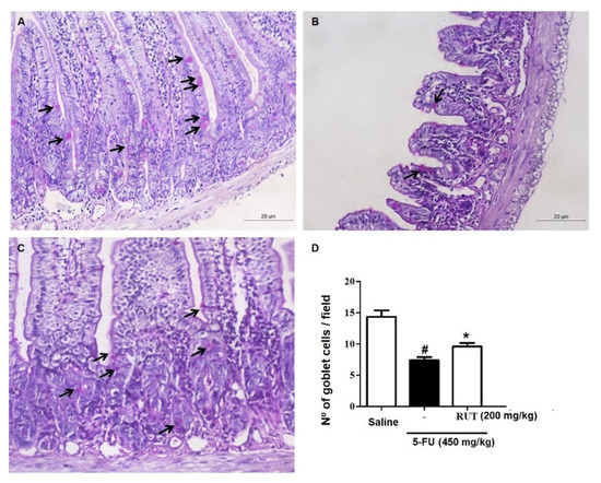 Analysis of goblet cells in the jejunal segment (Figure 10) revealed that 5-FU treatment significantly decreased the number of goblet cells in the intestinal mucosa (p < 0.05) when compared to saline treatment. However, treatment with 200 mg/kg RUT retained the goblet cell number (Figure 10C), when compared with that of 5-FU treatment (p < 0.05, Figure 10B,D).