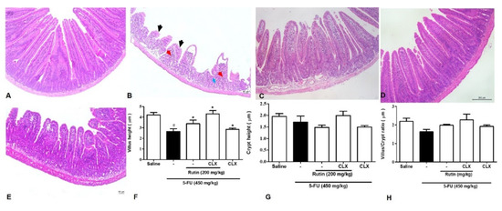 Regarding the jejunal crypts and the villus/crypt ratio in Figure 11G,H, no significant differences were observed between the 5-FU and the saline group (p < 0.05). Additionally, no significant difference was observed between the 5-FU group and the 200 mg/kg RUT and/or CLX groups.