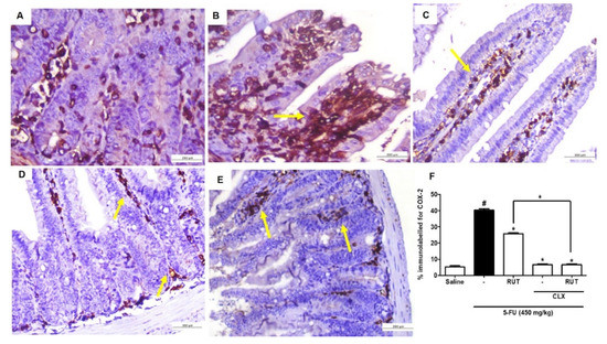 Using immunohistochemical analyses, we investigated the effects of 200 mg/kg RUT in the presence or absence of CLX on the COX-2 expression levels in 5-FU-induced intestinal mucositis. 5-FU promoted the intense immunostaining of COX-2 (Figure 12B) in the jejunal mucosa when compared with the saline group (p < 0.05) (Figure 12A,F). As shown in Figure 12C, pretreatment with 200 mg/kg RUT decreased COX-2 immunostaining when compared with the 5-FU group (p < 0.05). Similarly, CLX alone (Figure 12D) or the CLX and RUT 200 mg/kg combination (Figure 12D,E) decreased COX-2 immunostaining in mice presenting 5-FU-induced intestinal mucositis, when compared with the 5-FU group (p < 0.05).