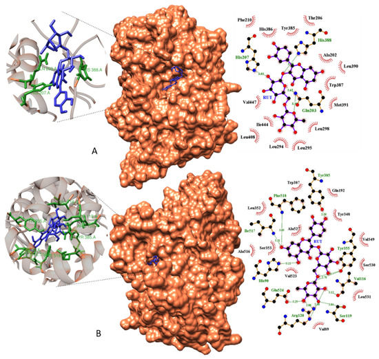 To investigate the underlying protective mechanisms of RUT against the 5-FU-induced intestinal mucositis, we performed a molecular docking analysis of the potential RUT target sites with COX-1 and COX-2 enzymes. Molecular docking of the RUT complex/COX-1 revealed a binding energy of −7.28 Kcal mol−1 and inhibition constant of 4.62 µM. Three hydrogen bond interactions at Gln203, His207, and His388 amino acid sites; the Gln203 residue demonstrated two hydrogen bond interactions at distances of 2.62 and 3.10 Å (Figure 11A). This site revealed the most concentrated molecular interactions of the complex, with high interaction energy near the edge of the active site of the receptor. The amino acids Thr206, Phe210, His386, Tyr385, Ala202, Leu390, Trp387, Met391, Leu298, Leu294, Leu295, Leu408, Ile444, and Val447 participated in the hydrophobic interactions (Figure 13A).