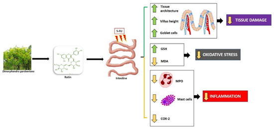 RUT, like many flavonoids, has demonstrated antioxidant properties [52], in addition to the ability to relieve oxidative stress in biological systems. We observed that RUT exhibited antioxidant effects against intestinal mucositis, increasing GSH levels and decreasing MDA levels in mice presenting 5-FU-induced intestinal mucositis; this was consistent with the findings of previous studies that demonstrated that RUT exerts antioxidant effects by decreasing MDA levels [53,54] and increasing GSH and superoxide dismutase levels [55,56,57].