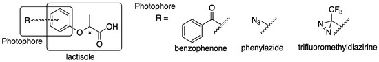 Photoaffinity labeling [7,8,9,10] is a useful biochemical method for the analysis of biological interactions between low-molecular-weight bioactive compounds and biomolecules. The methodology may afford other information near the binding sites which cannot be obtained from structure–activity relationship studies. Three major photophores—phenylazide, benzophenone and (trifluoromethyl)phenyldiazirine—are used for photoaffinity labeling [11]. We reported several preparations of gustatory ligands to elucidate gustatory receptors [12,13,14,15,16,17,18,19,20]; however, there are few studies on the synthesis of photoreactive lactisole derivatives which have aimed to elucidate their biological activities. In this paper, we describe the comprehensive synthesis of photoreactive lactisole derivatives (Figure 1), which we then used in an inhibitory activity assay for cell-based human sweet taste receptors.