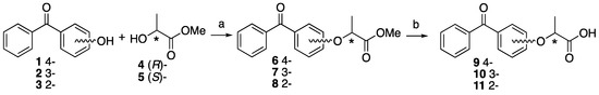 A few reports have described the preparations of racemic benzophenone-based lactisole derivatives and their separation by chromatography [21,22,23,24,25]. However, to date, the asymmetric synthesis of benzophenone-modified lactisole derivatives has not been reported. Hydroxybenzophenone derivatives (1–3), optically pure methyl lactate (4 and 5, 1.5 equiv.) and triphenylphosphine (1.2 equiv.) were preincubated at 0 °C for 10 min in dichloromethane and diethyl azodicarboxylate (1.5 equiv.) was slowly added to the solution. The reaction mixture was stirred at room temperature overnight and worked up with a general procedure. Purification with column chromatography afforded the optically pure methyl 2-benzoylphenoxypropionate derivatives 6–8 with a good yield. The methyl esters were subjected to chiral high-performance liquid chromatography (HPLC) with Chiralpak IG [2] to ensure the configuration of the chiral center. The methyl esters were hydrolyzed under reflux in the presence of K2CO3 to afford derivatives 9–13 in high yields (Figure 2).