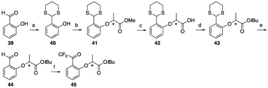 Then, 2-trifluoroactyl phenol, which was prepared by the Fries rearrangement of phenyl 2,2,2-trifluoroacetate with AlCl3 [34], was subjected to Mitsunobu reaction with chiral methyl lactate 4 and did not afford a 2-trifluoroacetyl lactisole skeleton. The Mitsunobu reaction of salicylaldehyde and methyl lactate 4 followed by the conversion of aldehyde to the trifluoroacetyl group also failed due to the instability of methyl ester for the condition of trifluoroacetyl construction. Protected salicylaldehyde was selected for trifluoroacetyl substitution at the 2-position of lactisole. The carbonyl group was protected by thioacetal 40 [35], then subjected to a Mitsunobu reaction with chiral methyl lactate 4 and 5 to construct lactisole methyl ester 41 in an identical manner to that described above. After the hydrolysis of methyl esters with methanolic NaOH under the reflux condition, carboxylic acid 42 was converted to lactisole tert-butyl ester 43, then thioacetal was deprotected with methyl iodide. Aldehyde 44 was treated with TMS-CF3 followed by oxidation with Dess–Martin periodinane [20] to afford 2-trifluoroacetyl-substituted lactisole tert-butyl ester 45 (Figure 6).