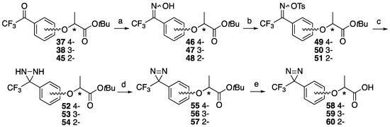 Each trifluoroacetyl-substituted lactisole tert-butyl esters (37, 38, 45) was subjected to diazirine constructions, oximation with hydroxylamine hydrochloride 46–48, tosylation for hydroxyl group of oxime 49–51, diaziridine formation with liquid ammonia 52–54, and oxidation with activated MnO2 to obtain 55–57, which were checked by chiral center configuration. tert-Butyl esters were hydrolyzed with trifluoroacetic acid to afford trifluoromethyldiazirine-based lactisole derivatives in moderate yields. The one-pot conversion of the tosyl oxime 49 to diazirine 55 [36] was also acceptable for the preparation with an identical yield (Figure 7).