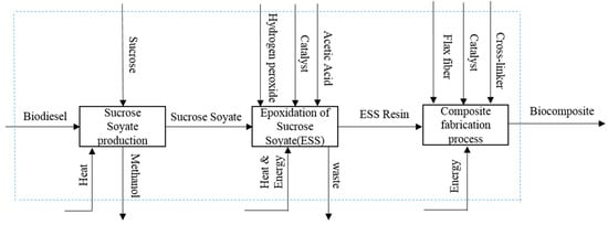 ESS resin is produced via epoxidation of sucrose soyate, which is produced from transesterification of methyl ester of soybean oil and sucrose. The system boundary for this LCA study includes: (1) production of ESS resin, and (2) production of ESS-based biocomposite (Figure 1). Production of ESS resin in our model consists of (1) transesterification of methyl ester of soybean oil (Biodiesel) and sucrose to generate sucrose soyate, and (2) epoxidation of sucrose soyate. Soybean is a dominant oil seed in the U.S. and in the past three years, the U.S. has been the largest producer of soybean oil in the world [17]. Therefore, the U.S. is considered the geographical boundary of the life cycle. The selected functional unit for this study is 1 kg of composite.